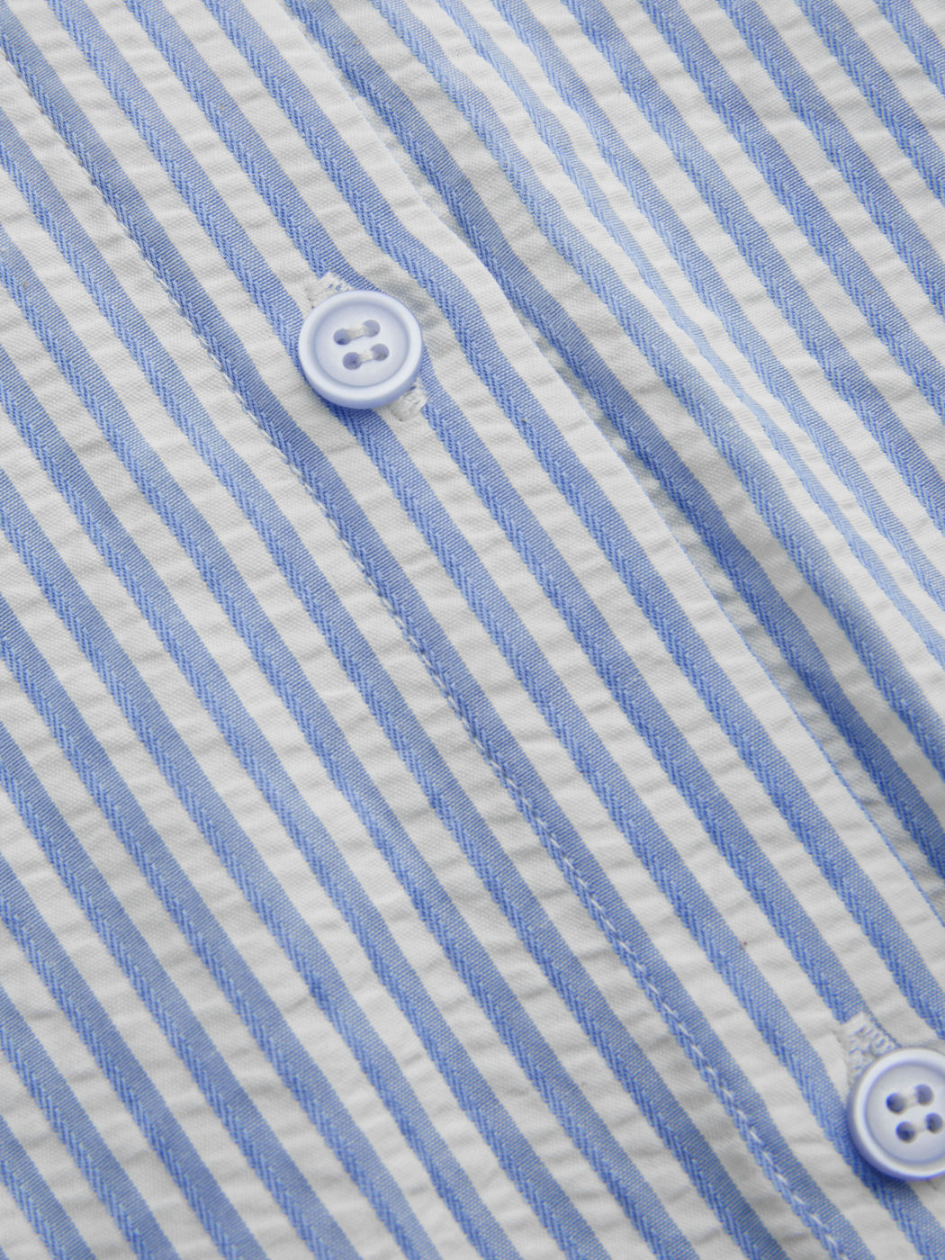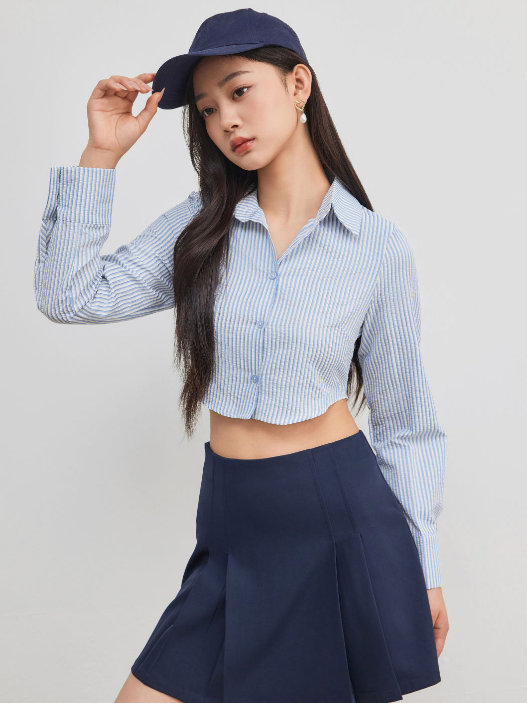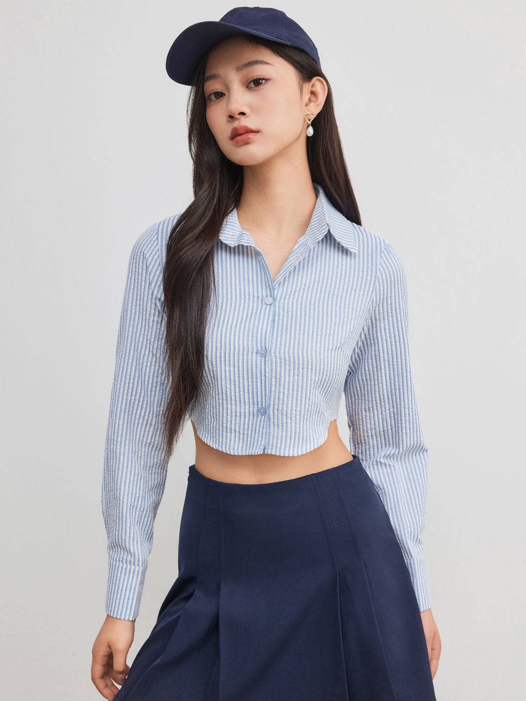 Cotton-blend Collar Striped Crop Long Sleeve Shirt