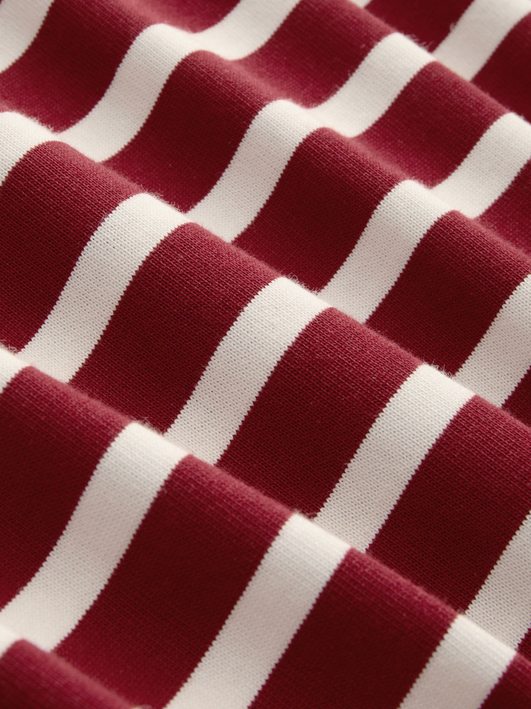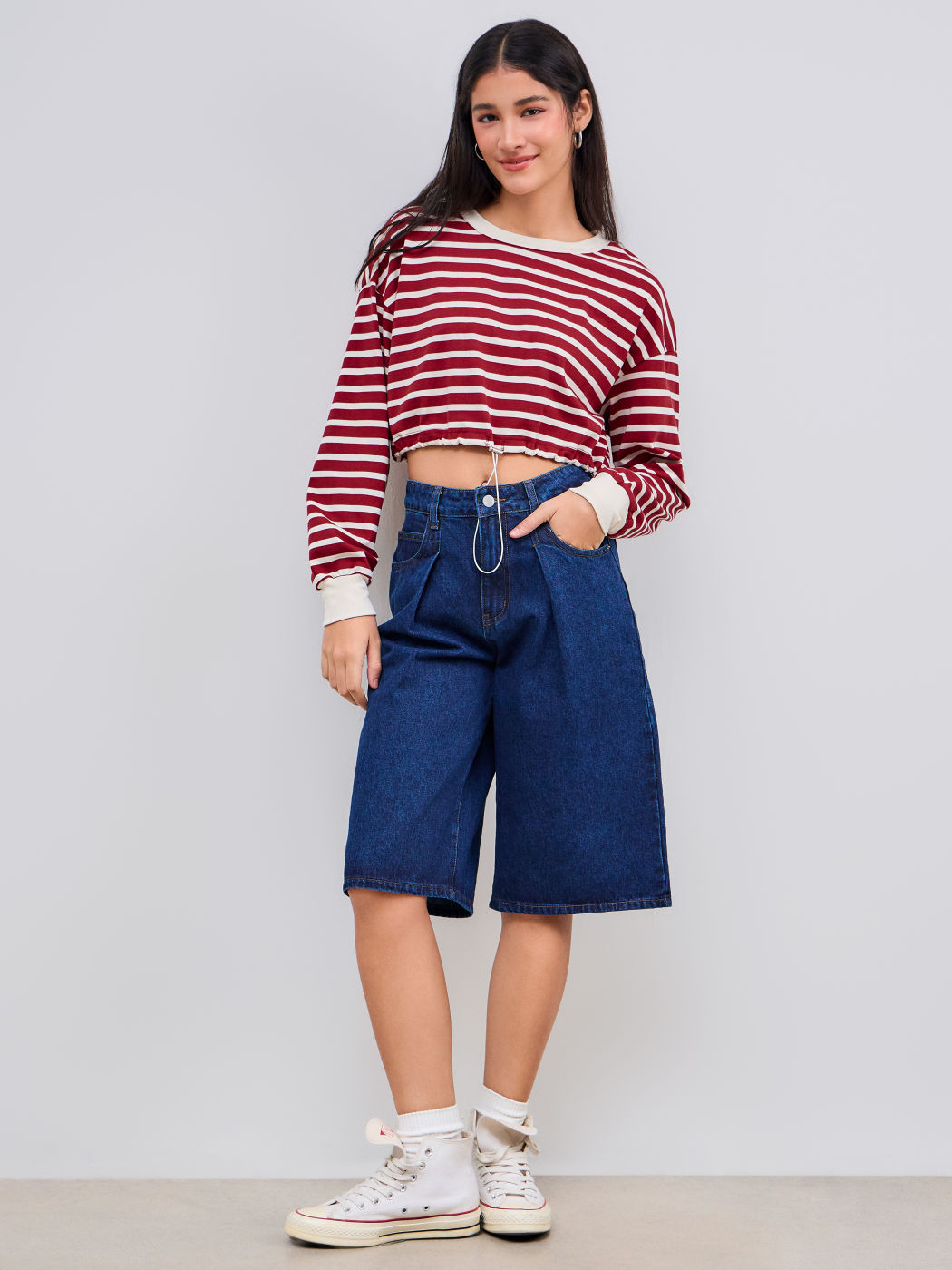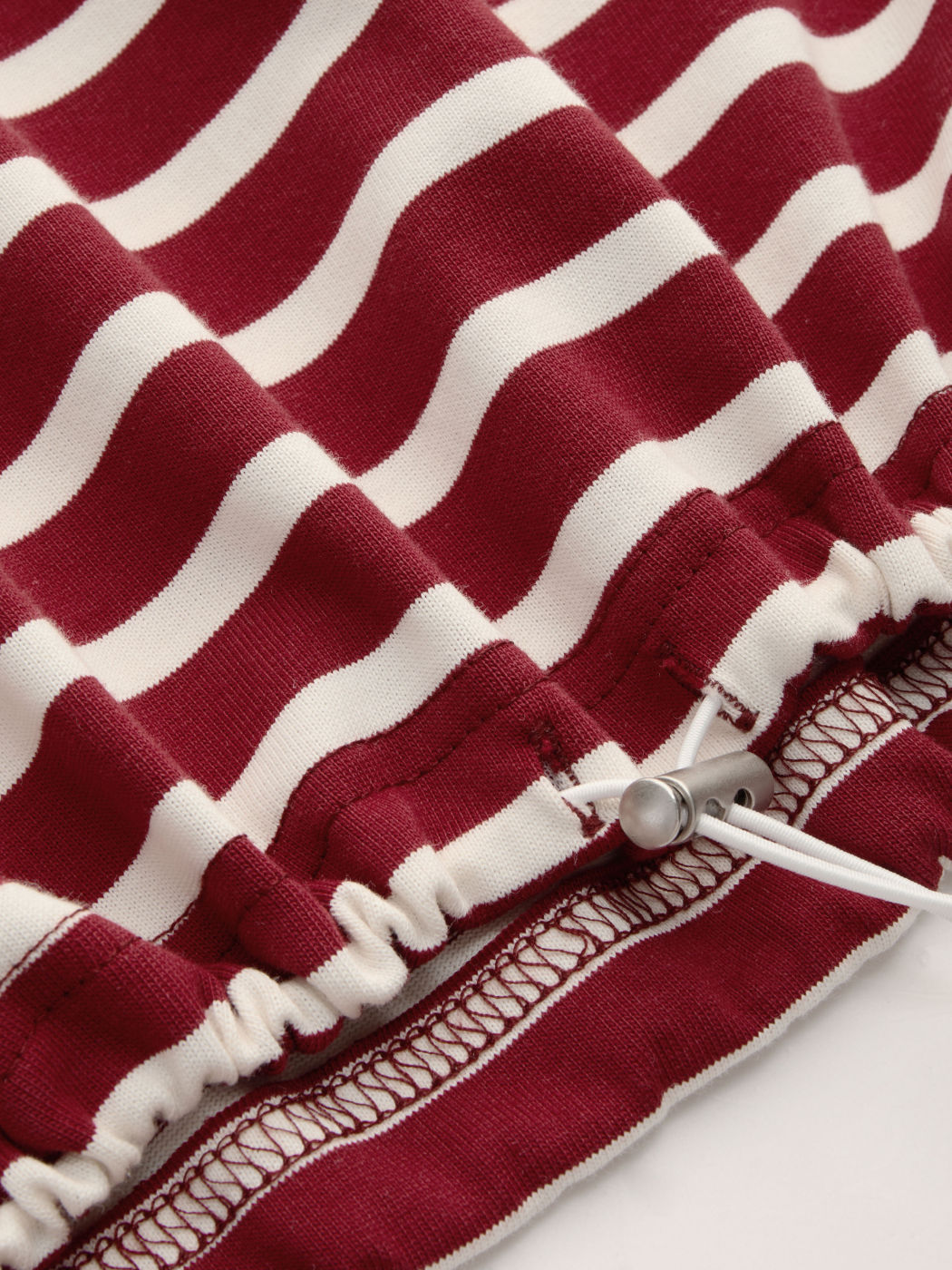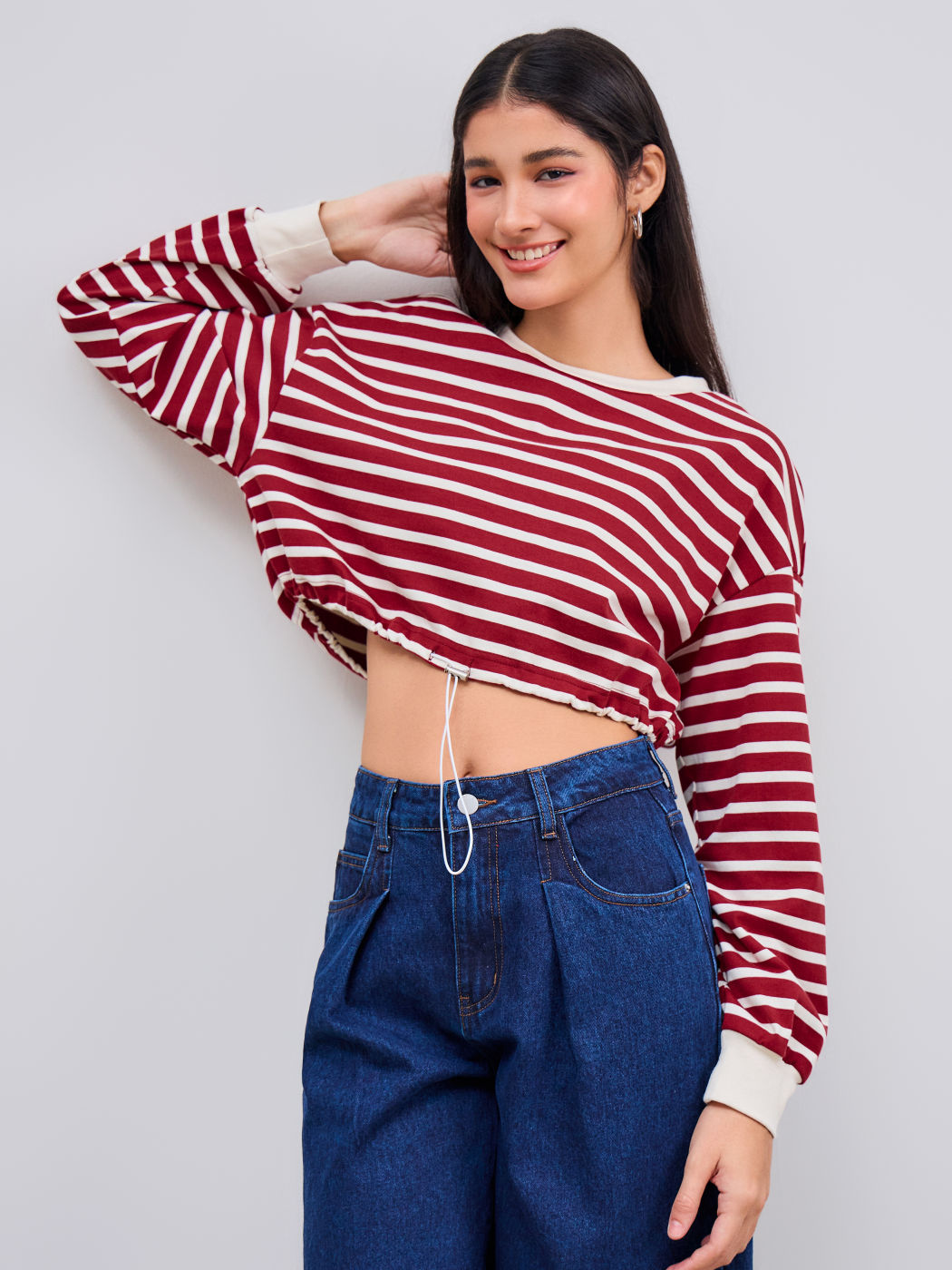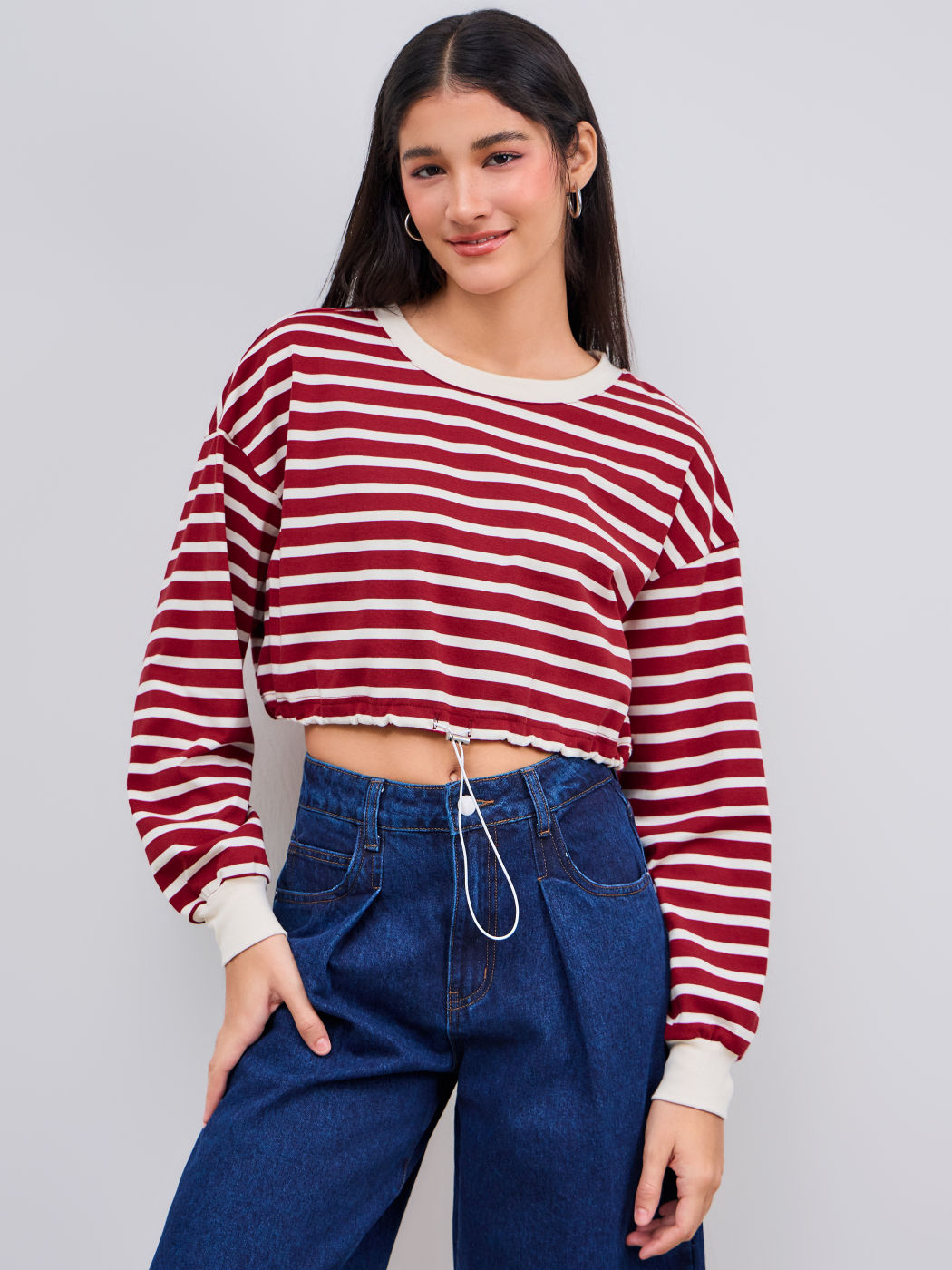 Cotton-blend Round Neckline Striped Drawstring Long Sleeve Crop Tee