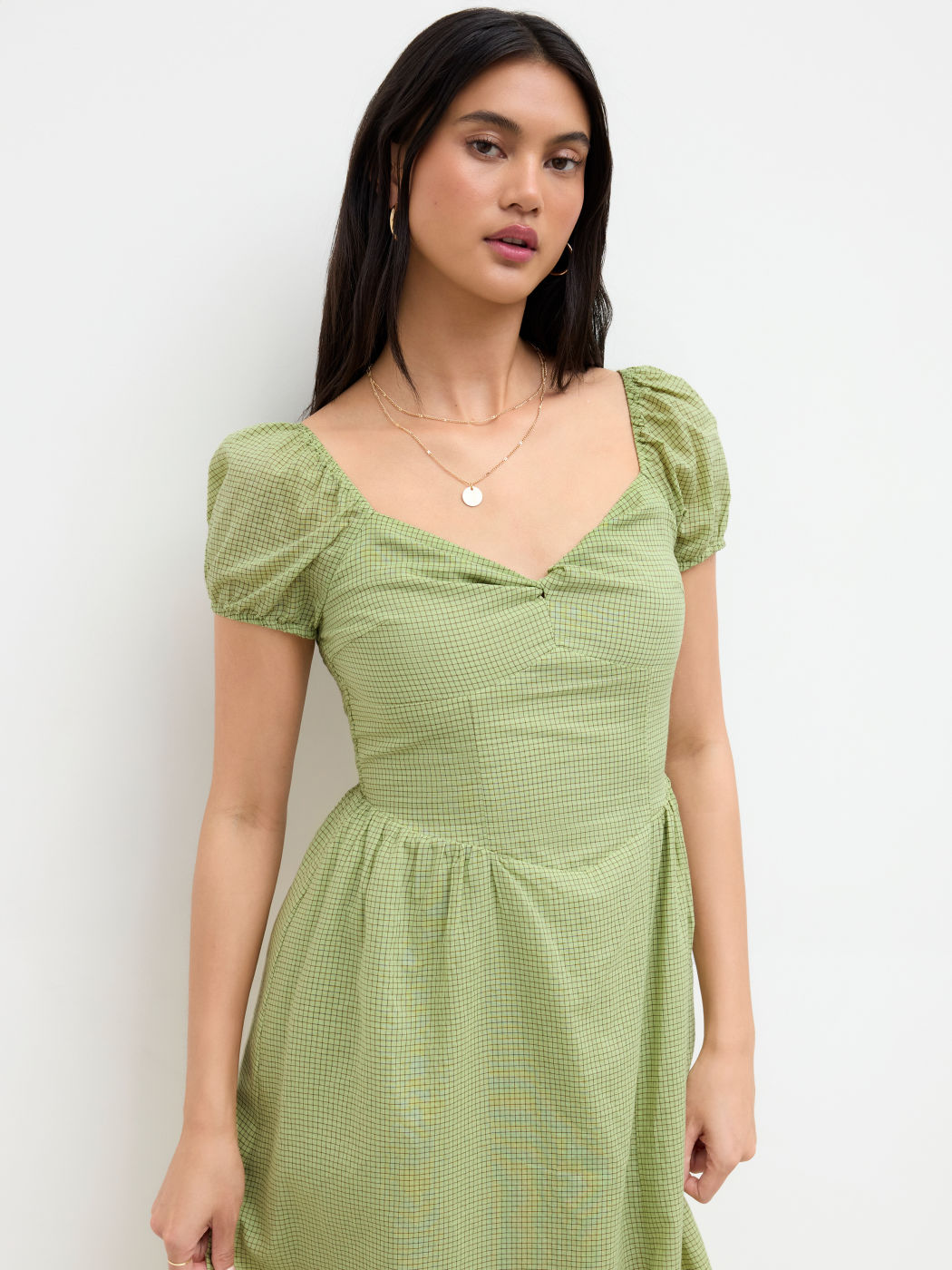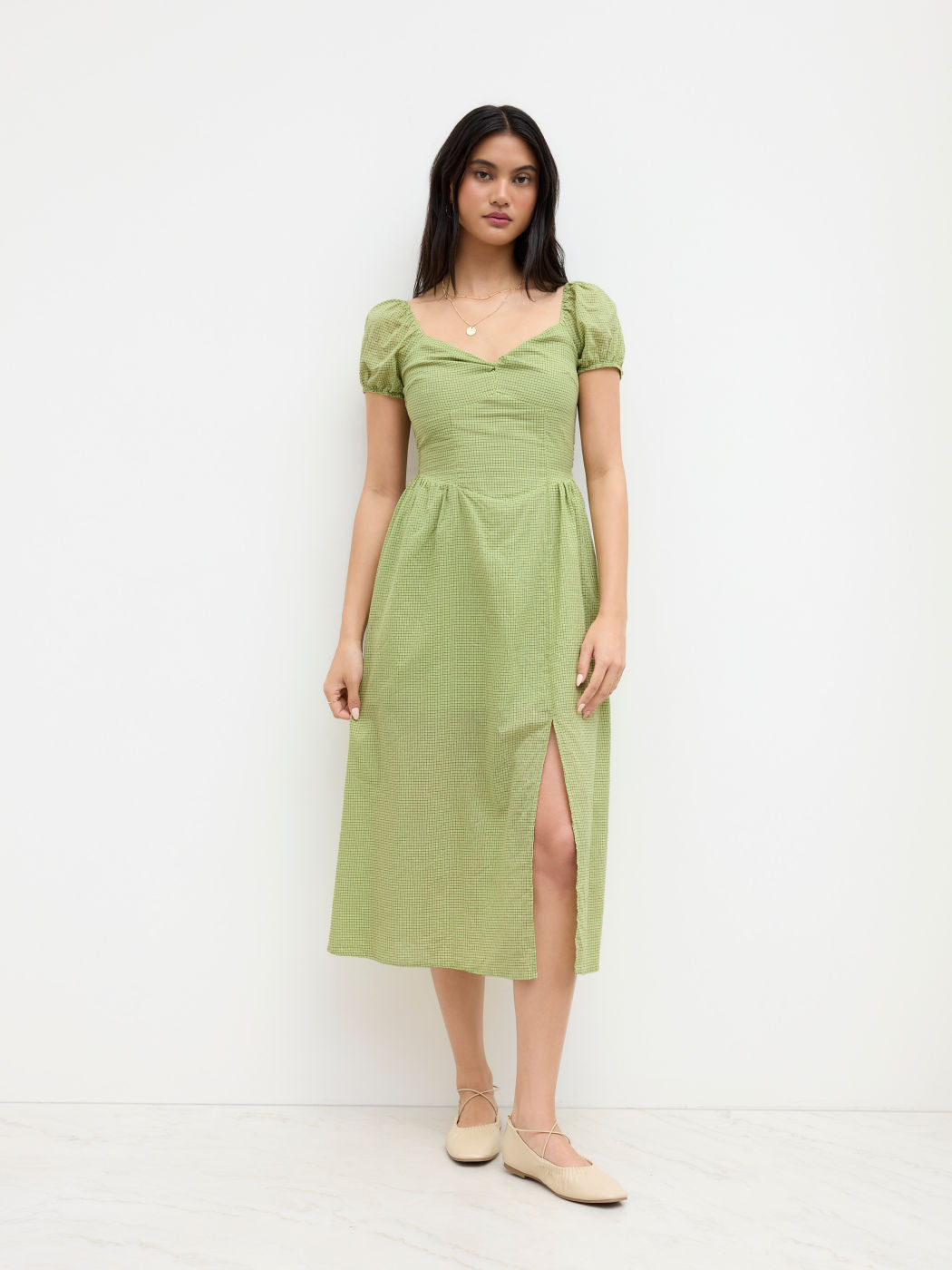 Cotton-blend V-neck Check Twist Split Midi Dress