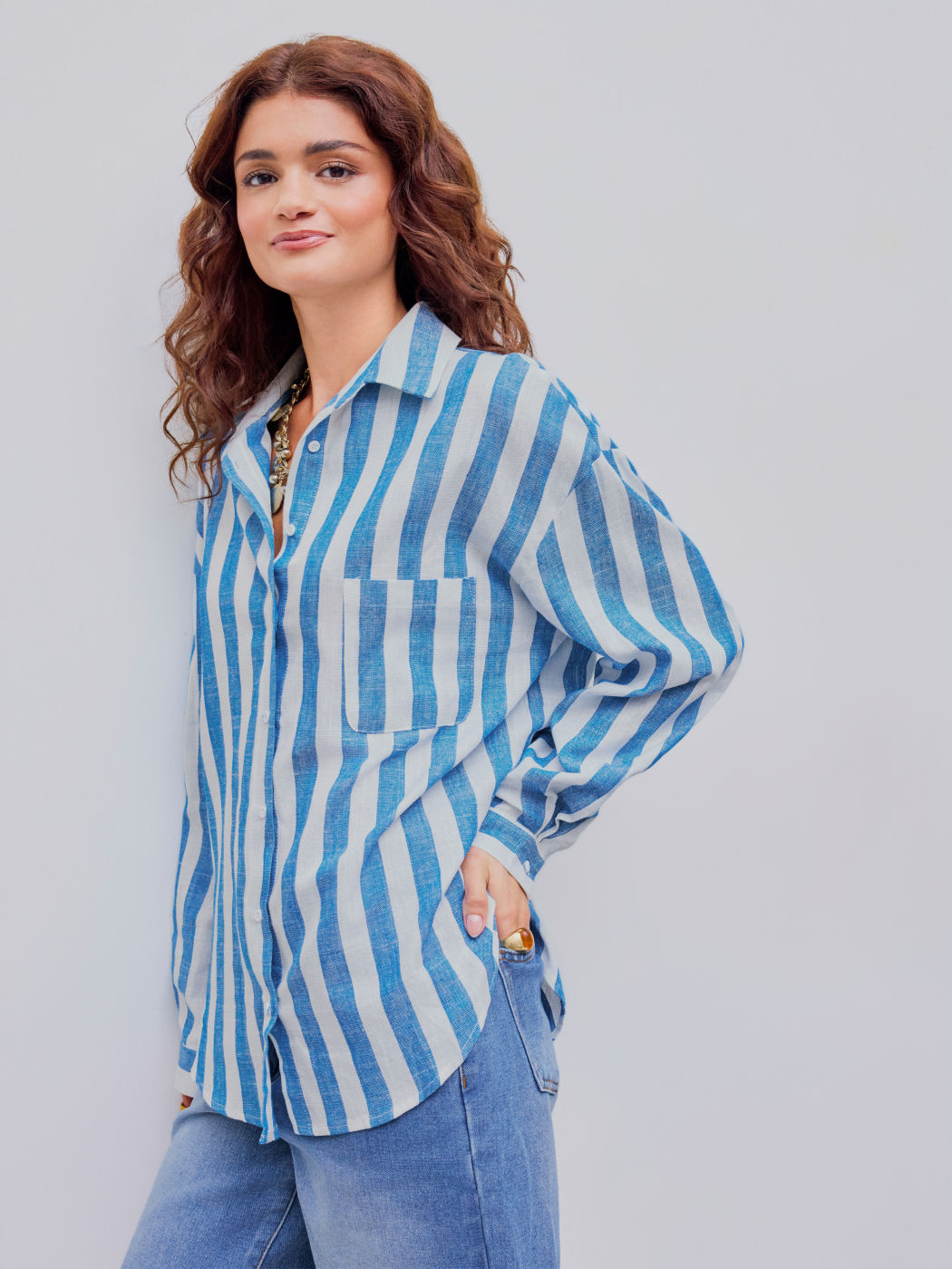 Linen-blend Collar Striped Pocket Long Sleeve Shirt