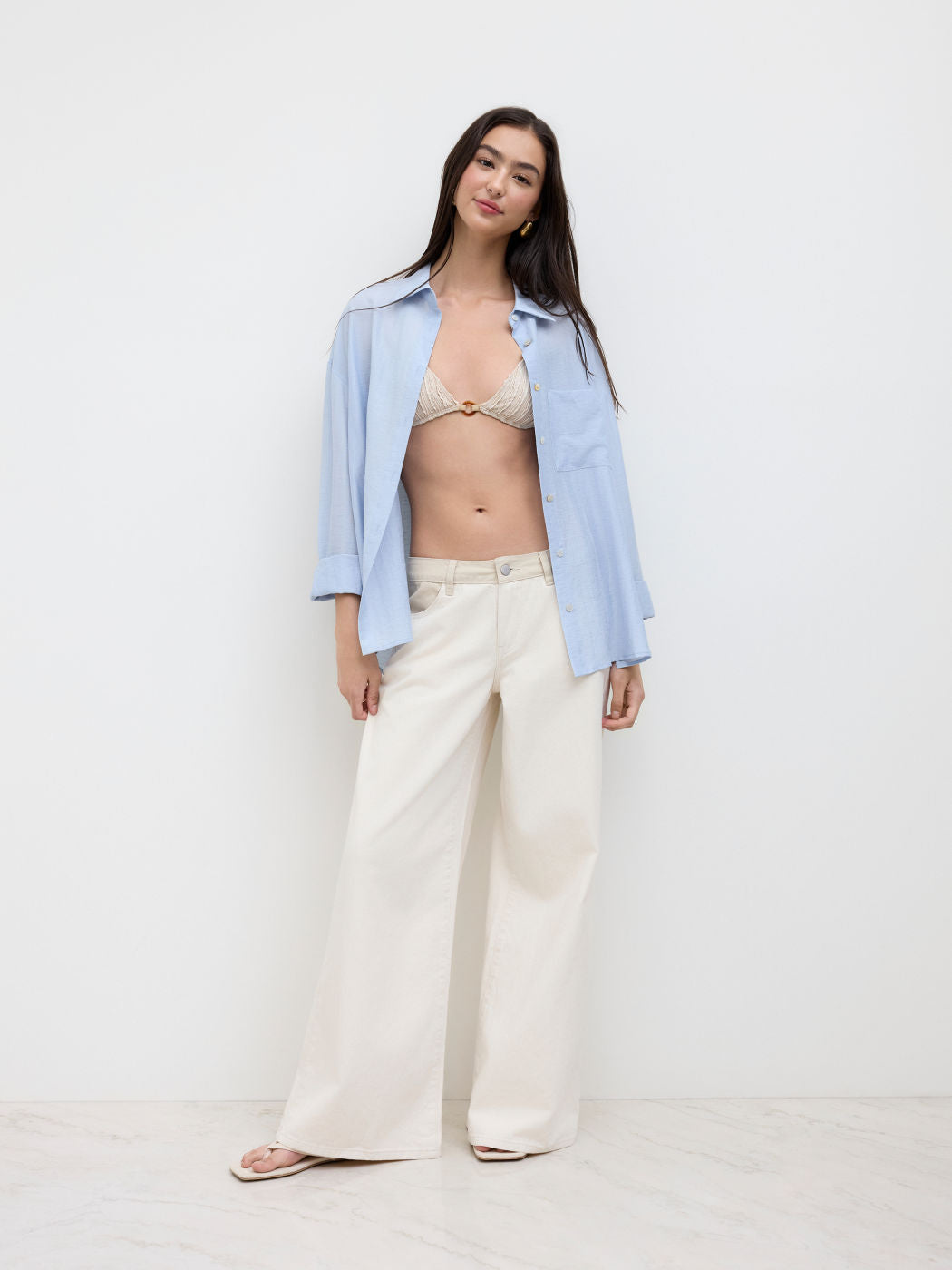 Linen-blend Polo Neck Oversized Long Sleeve Shirt