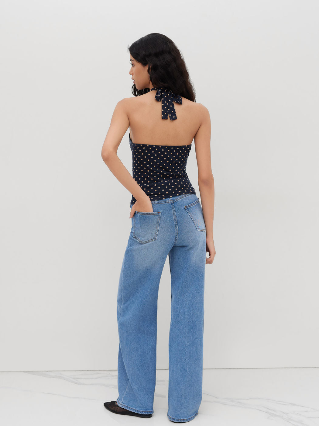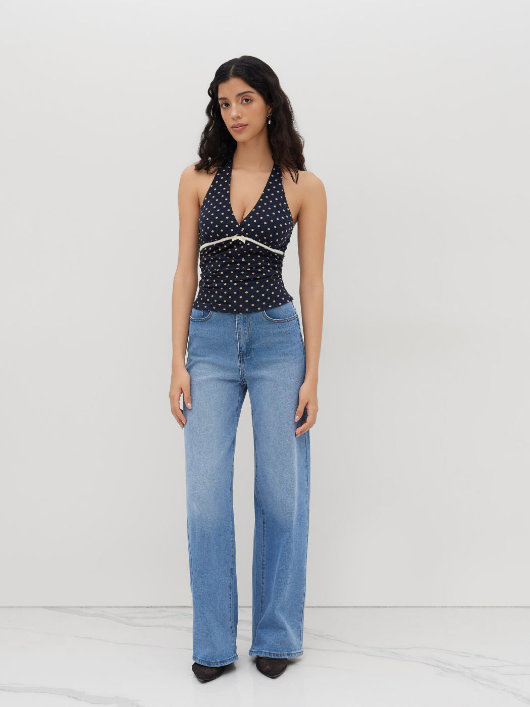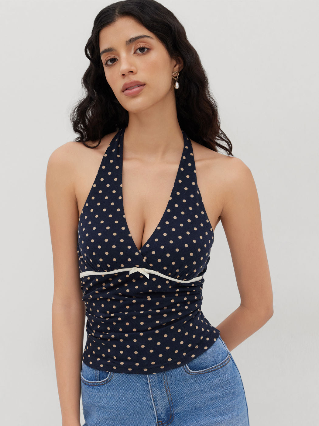 V-neck Halter Polka Dot Bowknot Ruched Tank Top